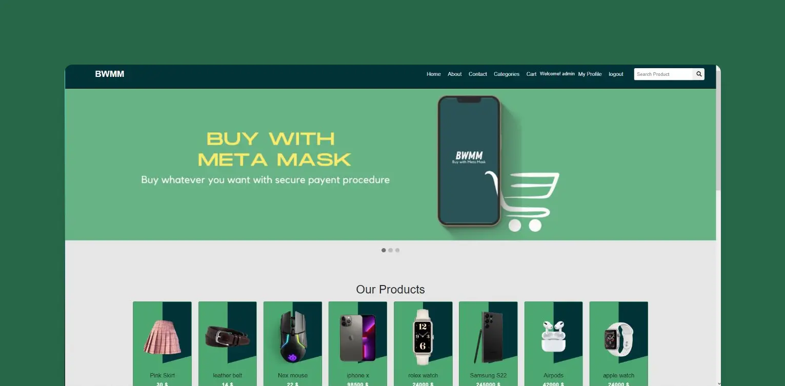 Crypto payment integration for e-commerce. Implemented cryptocurrency payment functionality using MetaMask alongside traditional payment gateways like Stripe. Seamless Web3 payment flows.
