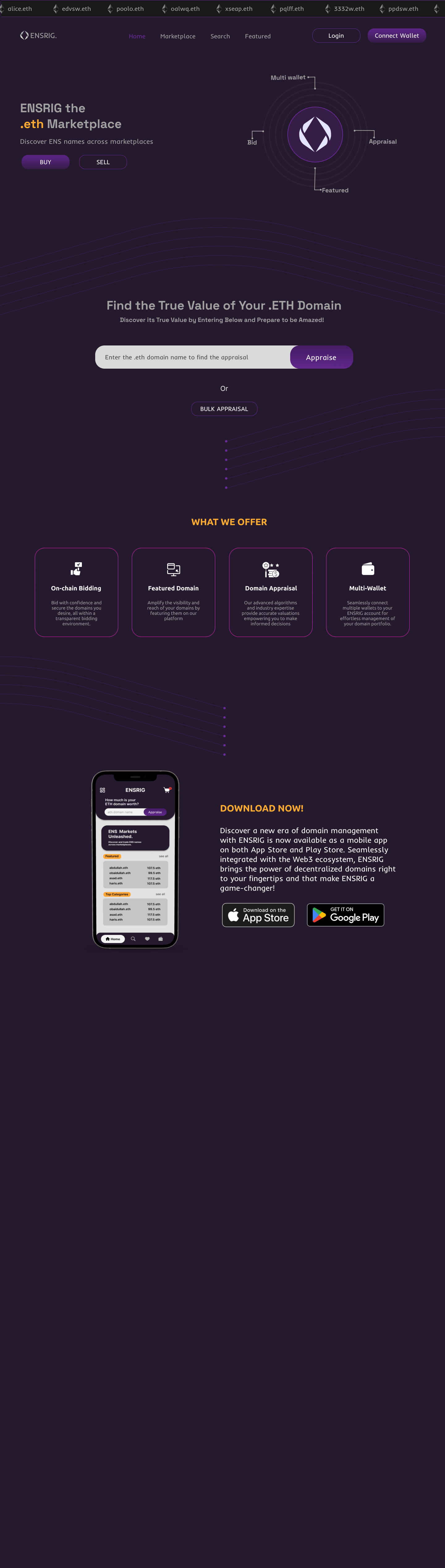 Ethereum Name Service (ENS) Marketplace with AI-powered domain appraisal. Users can buy, sell, and evaluate ENS domains. Web frontend using Next.js and mobile app using Flutter. Ethereum smart contracts and blockchain data for decentralized domain ownership.